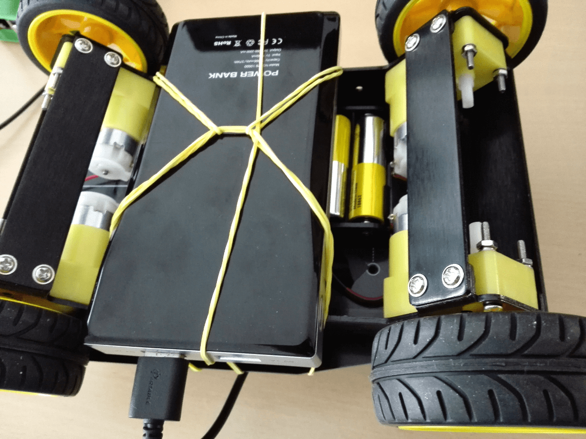 Sobald alle 4 Kabel angeschlossen sind ist die Montage fertig. Wenn man nun die Batterien ins Akkufach gibt, beziehungsweise einen geladenen Akku anschließt und den Schalter auf 1 stellt sollten die LED Lichter des Boards leuchten. Die Motoren bewegen sich noch nicht, das können wir erst mit der Software über den Raspberry Pi machen.