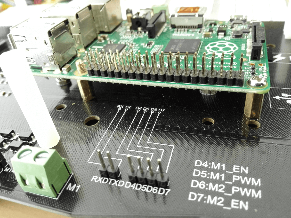 Die Motoren können über die 4 Pins D4, D5, D6 und D7 angesteuert werden. Die Platzierung vom Raspberry Pi passt perfekt, die GPIO Pins liegen nicht weit entfernt und können einfach über female-female Steckdrähte angeschlossen werden.