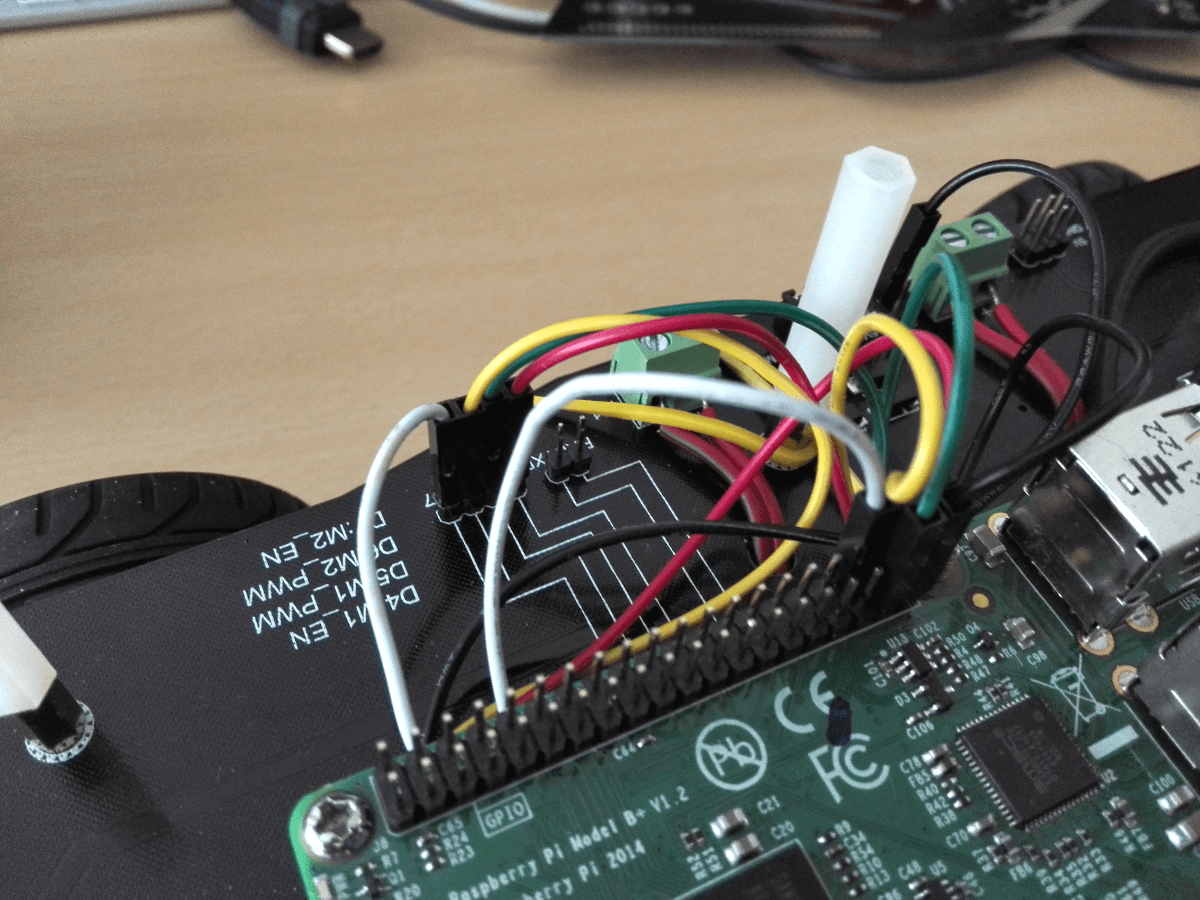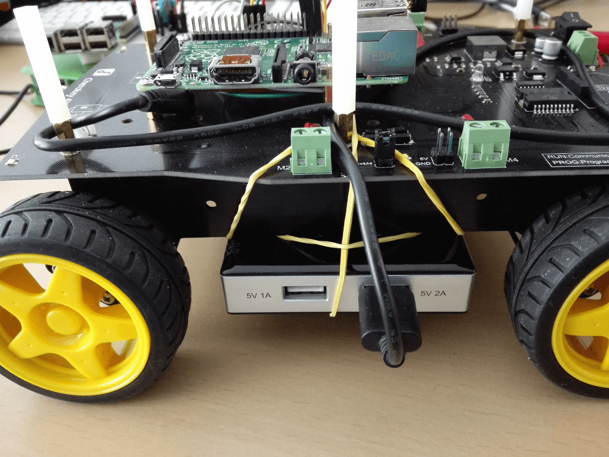 Bei meinem Bausatz wird das Board und damit die Motoren über 5 1.5 Volt Batterien, also insgesamt 7.5 Volt, mit Spannung versorgt. Die DC Motoren benötigen eine Betriebsspannung von 6-12 Volt mit maximal 2 Ampere, sind also ziemlich flexibel. Die normale Spannung von 5 Volt vom Raspberry Pi reicht nicht aus um die Roboter Motoren ansteuern zu können. Aus diesem Grund habe ich neben den 5 Batterien noch meine Powerbank auf das Chassis geschnallt um den Pi zu betreiben. Aktuell wird es noch mit Gummiringerl festgehalten, ich überlege schon den Kauf einer kleineren Powerbank dir neben den Pi passt…das hat aber noch Zeit bis alles fertig ist. Angeschlossen wird die Steuereinheit direkt mit 5 female-female Steckdrähten an das Board.