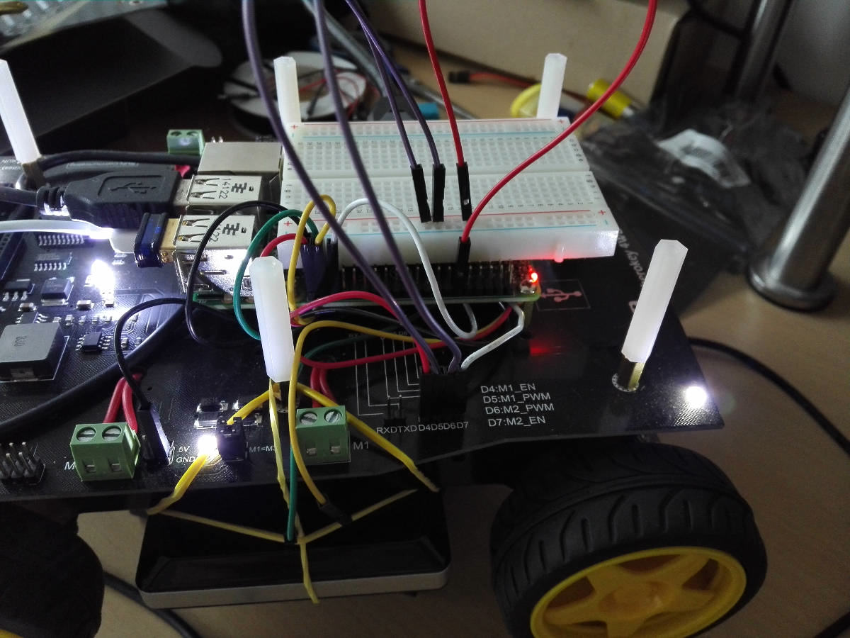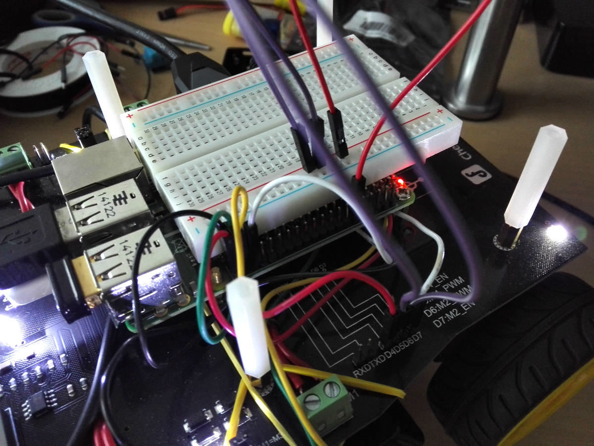 Die schlechte Nachricht zuerst: wir müssen eine Modifikation an der Verkabelung vornehmen. Die gute Nachricht: es wird sogar etwas einfacher! Bis jetzt verwendeten wir 2 Pins für die Geschwindigkeit der linken und der rechten Seite. Dazu auch 2 Kabel (grün und gelb). Diese werden nun entfernt. Ersetzt werden diese durch einen einzigen Pin – wir erinnern uns: es gibt nur einen PWM Pin am Raspberry Pi. An diesen müssen wir nun 2 Kabel hängen und mit dem Roboterboard verbinden. Zu diesem Zweck benötigen wir ein Steckbrett – alternativ kann man diese Kabel auch zusammen löten.